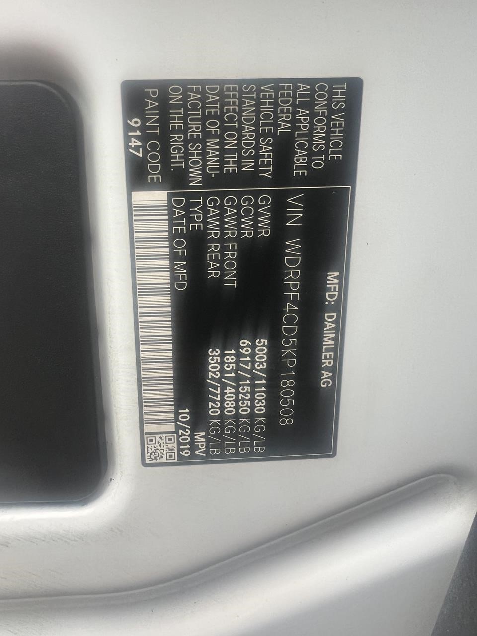2019 FREIGHTLINER 3500 4X2 SPRINTER MID ROOF VAN